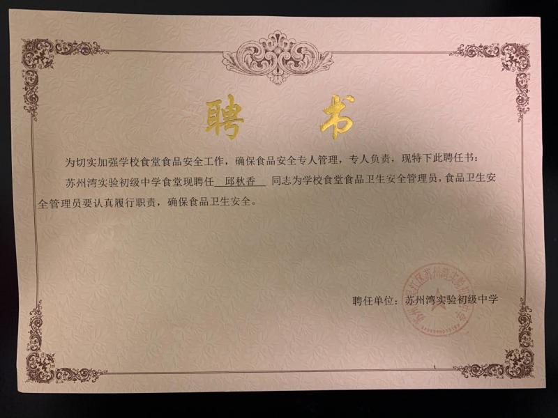 3、建立健全本校食品安全领导小组,聘任学校食品安全管理员;